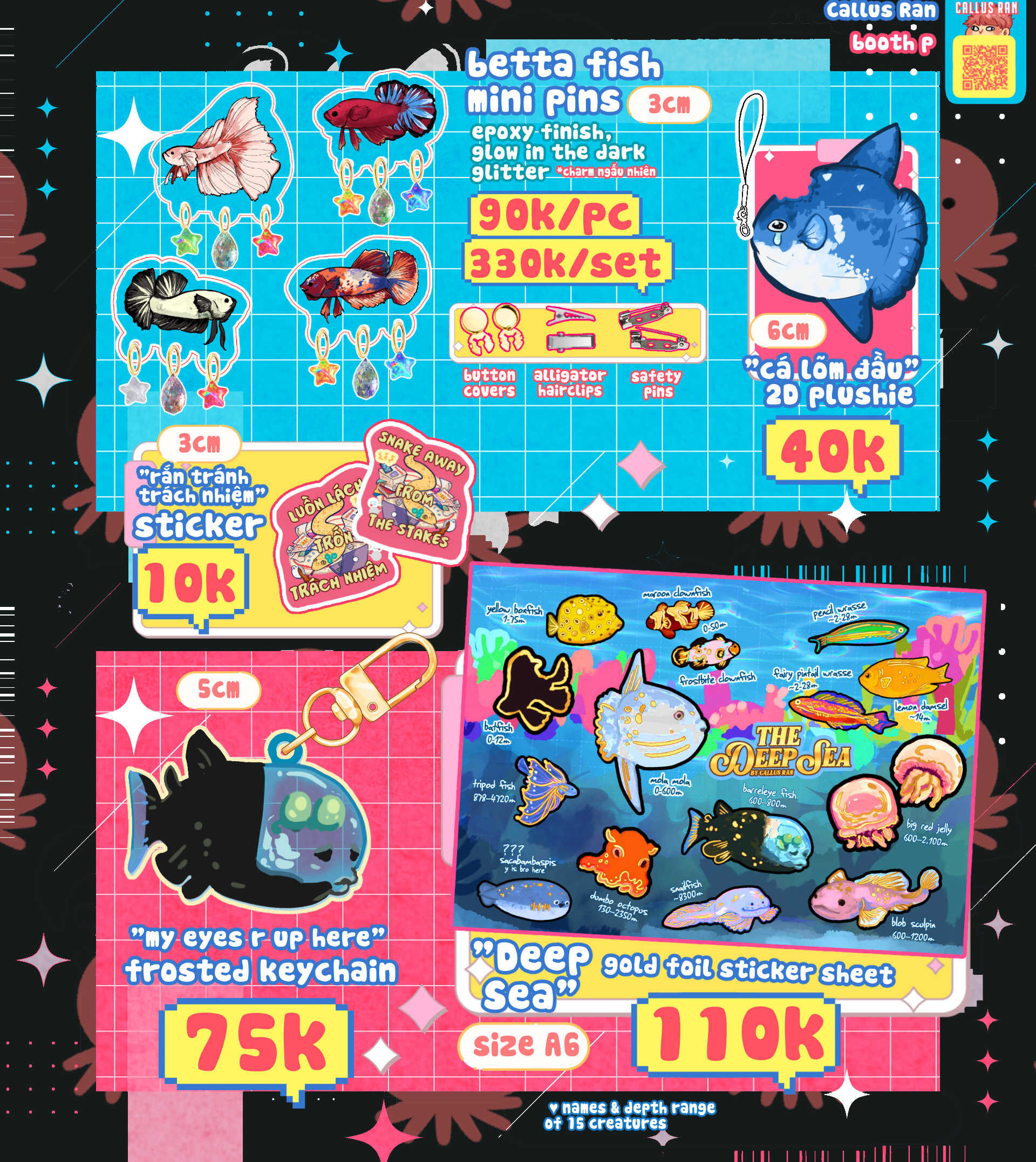 | **Devil May Cry, Fear and Hunger, Nine Sols, Sally Face, Dispatch, Fallout, Mouthwashing, Blasphemous, Umamusume, Red Dead Redemption 2 | BTS, My Chemical Romance | Good Omens, Dungeon Meshi | Original Mascot, Mèo, Sacabambaspis, Cá các loại, Phụ kiện Handmade** |